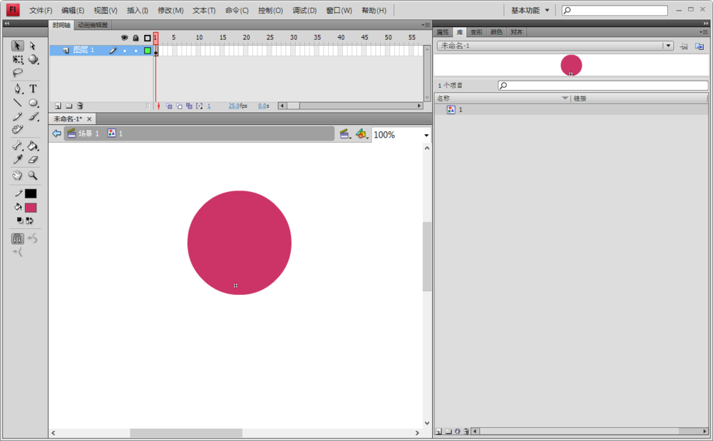 2、这里,我演示一个红色圆的路径动画,利用快捷键ctrl+F8新建一个元件1,画一个圆
