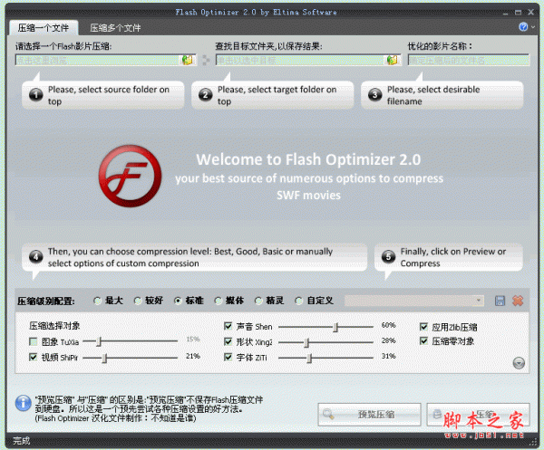 初学者制作flash,由于素材体积的原因,做成的动画文件往往很大。可是如果需要应用于网站等地方,体积大了显然不利于浏览。在这里我提供两种方法来压缩flash,减少占用的空间。第一种方式是制作flash时压缩体积;第二种方式是借助第三方软件来压缩swf文件。