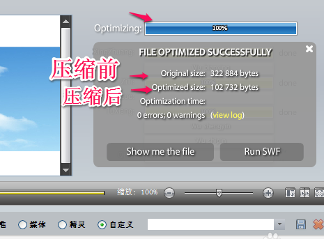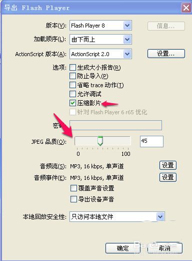 3、选择flash,设置压缩参数,进行压缩。压缩选择对象中的“图像”如果选中了会大大降低flash 体积,但图像质量也会大大降低。