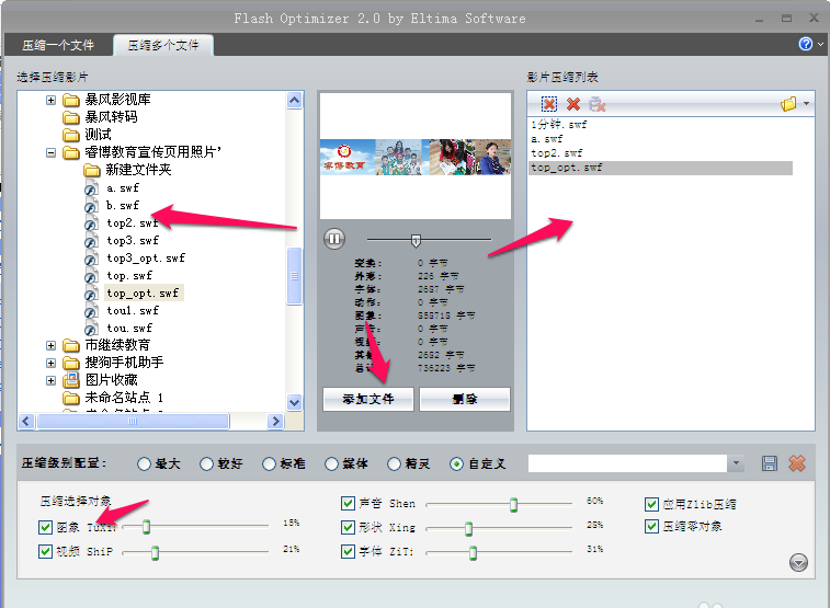 5、在“压缩多个文件”选项卡中,你也可以选择多个文件同时压缩。再也不用担心很多flash批量压缩的问题了。