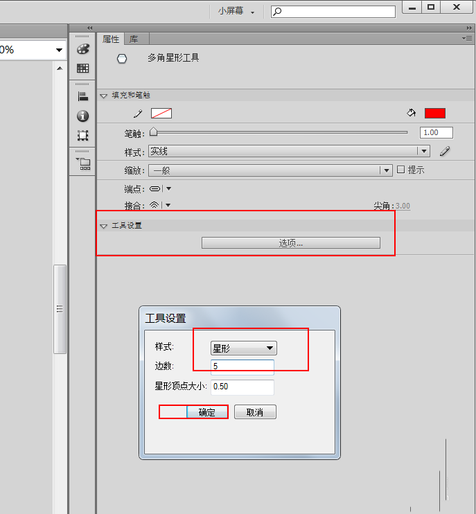3、在属性面板中,点击选择“工具设置”, 再打开的对话框里样式选择“星形”,边数设为5。