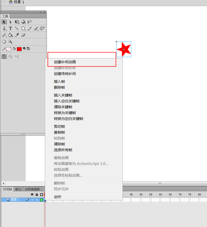 5、在图层1的时间轴中选中第一帧,右击创建补间动画,这是时间轴就会自动延长到24帧
