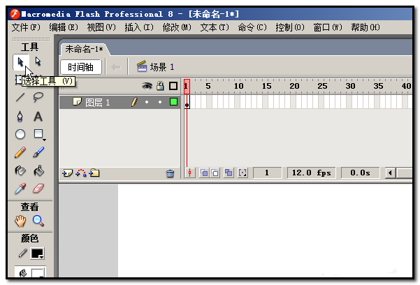 1、下图是flash的操作界面;左边是工具箱;中间空白位置是舞台。