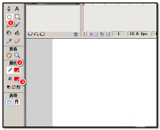 2、现在,开始绘制同心圆。在工具栏这里点下椭圆工具,把笔触颜色和填充颜色设置为红色。
