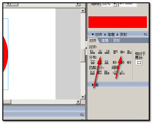 6、正圆是在选中的状态,在对齐面板这里,点“水平中齐”再点“垂直中齐”。点“水平中齐”再点“垂直中齐”后,舞台上的正圆即上下左右居中于舞台;并与红色圆中心重合在一起。