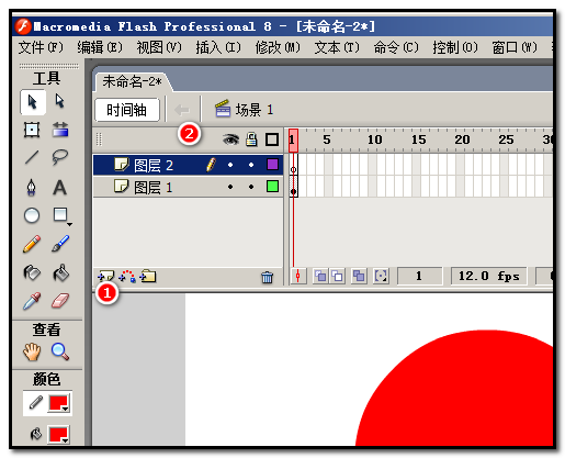 4、点“水平中齐”再点“垂直中齐”后,舞台上的正圆即上下左右居中于舞台。在图层面板,插入一个新图层。为图层2.