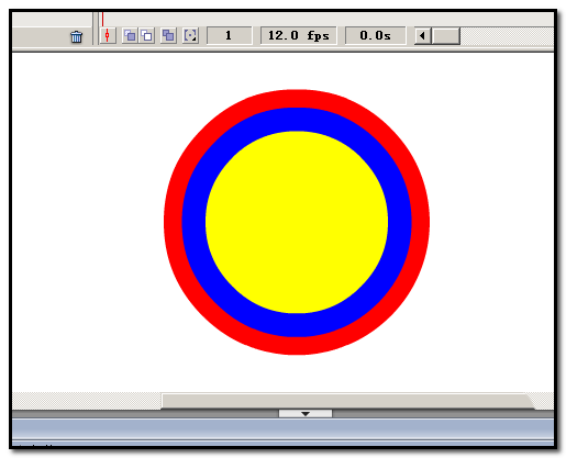 7、同样方法,再新建图层为图层3,再画出黄色的正圆;并居中于舞台,与红色、蓝色两圆中心点重合。