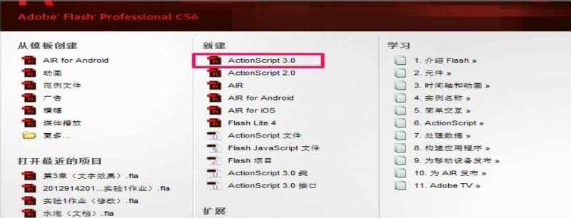 1、双击打开Flash CS6软件,选择并点击【新建】栏下的【ActiveScript 3.0】创建新的Flash空白文档。