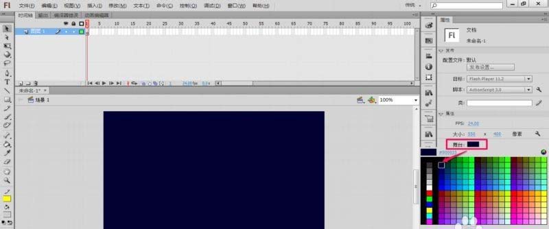 2、在左侧的“属性”面板中修改舞台背景颜色为深蓝色(亦可选择自己喜欢的背景颜色)。