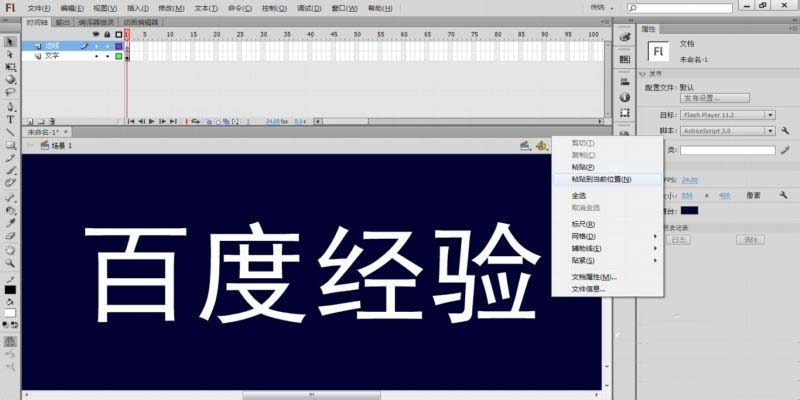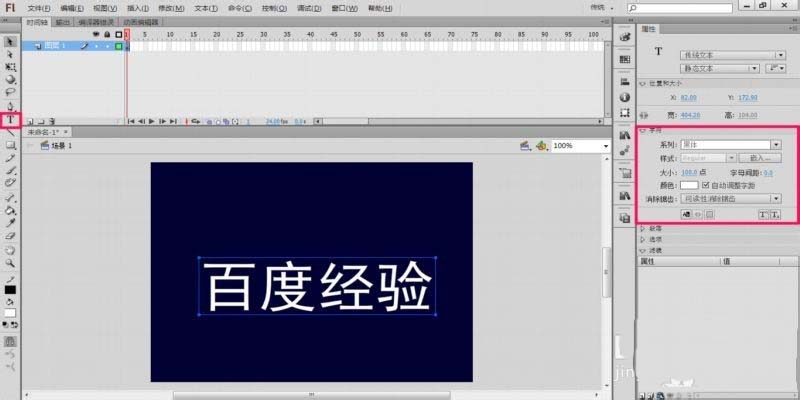 3、选择“文本工具”,并在“属性”面板中设置好文字的大小、颜色等参数,并在舞台上输入所需要的文字。