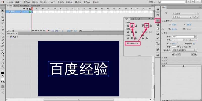4、选中文字,打开“对齐”面板,勾选“与舞台对齐”,并分别选择和点击“水平中齐”和“垂直中齐”。