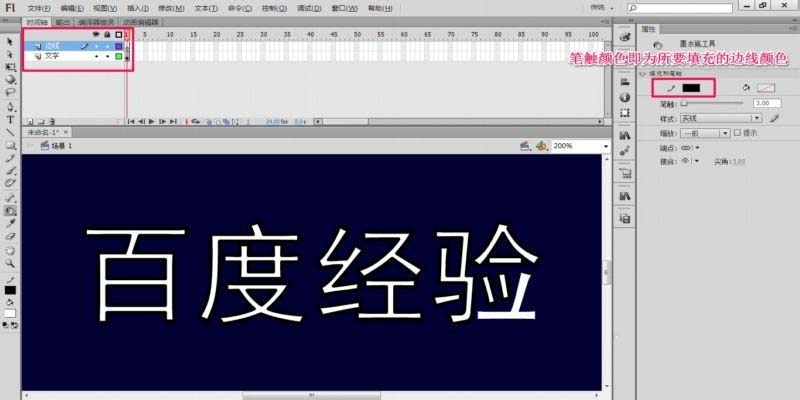 6、选择“墨水瓶工具”为打散后的文字描边(将墨水瓶移到文字笔画的边缘处点击一下鼠标左键即可);新建图层2,并将图层1和图层2分别命名为“文字”和“边线”。
