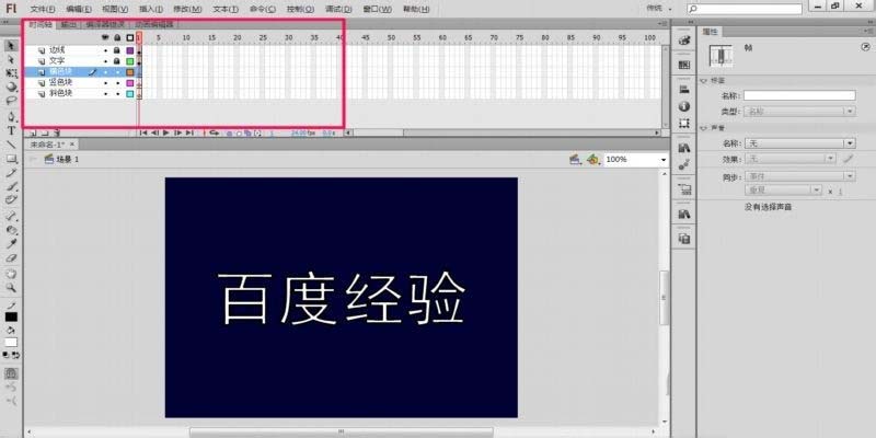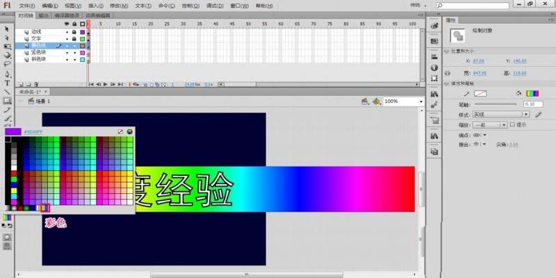 9、在“文字”和“边线”层的第100帧处单击右键选择“插入帧”,选中“横色块”图层,设置填充颜色为彩色,然后用“矩形工具”绘制一个较长的矩形,并移动到合适的位置。