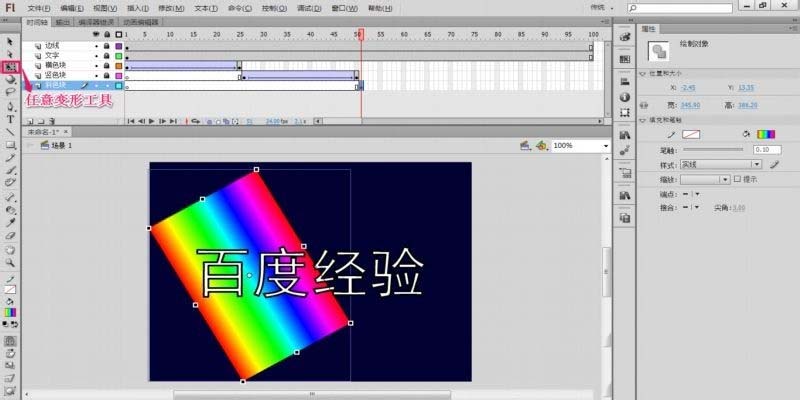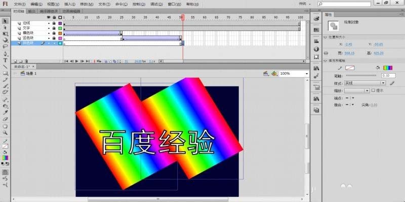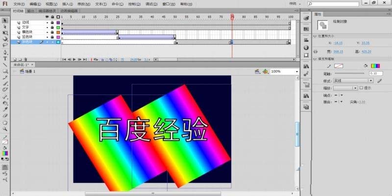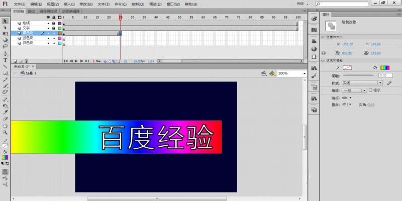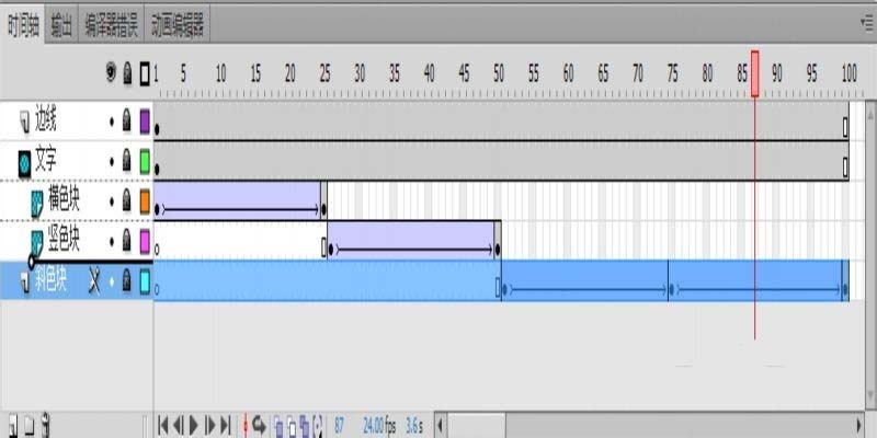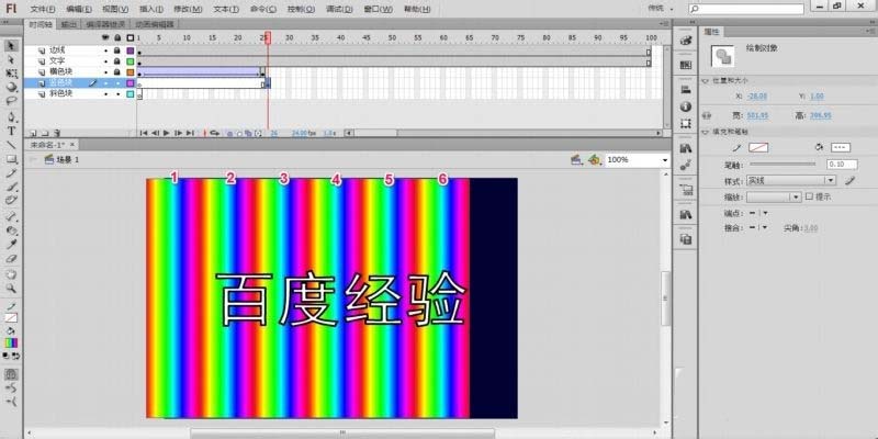 10、在“横色块”图层的第25帧处插入关键帧,将彩色矩形向左移动,并在第1帧至第25帧之间创建传统补间,锁定图层。