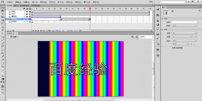 12、在“竖色块”图层的第50帧处插入关键帧,将彩色矩形向右移动,并在第26帧至第50帧之间创建传统补间,锁定图层。