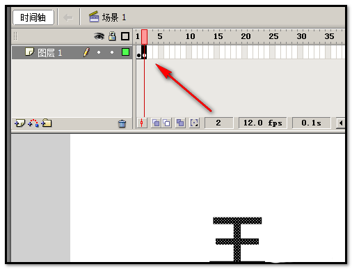 1、新建FLASH文档;默认图层为图层1。在文档图层1舞台上输入文字,比如“王”字。
