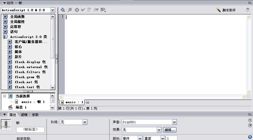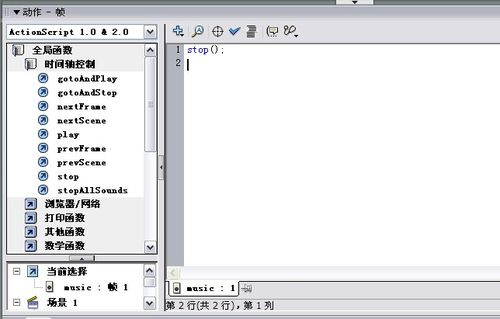 6、下面开始管理音乐。现在我们要使音乐一开始是停止的,点击播放按钮才会播放。把音乐往后拖一个帧,然后在第一帧处点击F9,打开动作面板。打开全局函数,打开时间轴控制。然后点击stop.