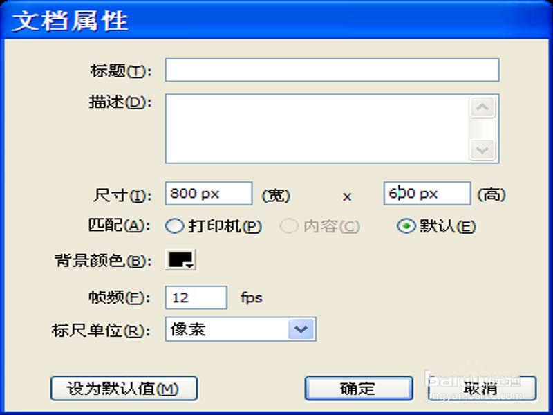 1、首先启动flash8,新建一个flash文档,大小设置为800*600,背景颜色为黑色,帧频为12fps。