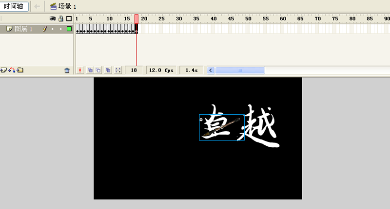 5、选择文字连续两次执行ctrl+b组合键将文字打散,从库中拖拽毛笔元件到舞台上,按f6插入关键帧,并将毛笔拖拽到第一个字的最后一笔处。