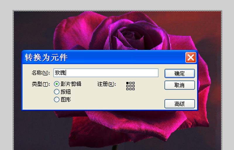 3、采用同样的方法导入玫瑰花,锁定图层1,右键单击玫瑰花从下拉菜单中选择转换为元件选项,设置类型为影片剪辑,点击确定按钮。