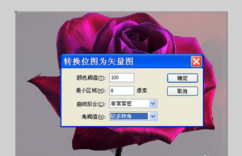 4、双击舞台上的玫瑰花进入影片剪辑的编辑区域,新建图层2,将库中的玫瑰花拖拽到编辑区域,选择该玫瑰花,执行修改-位图-转换位图为矢量图命令,在弹出的对话框中设置曲线拟合为非常紧密,角阈值为转多转角,点击确定。