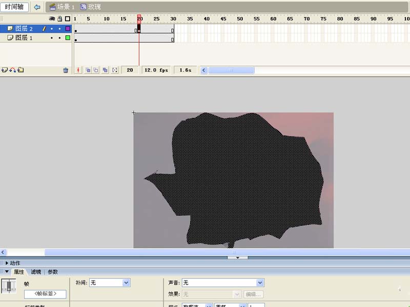 5、打开属性面板设置填充颜色为黑色,分别在图层1和图层2的第30帧处插入帧,在图层2的第20帧处插入关键帧。