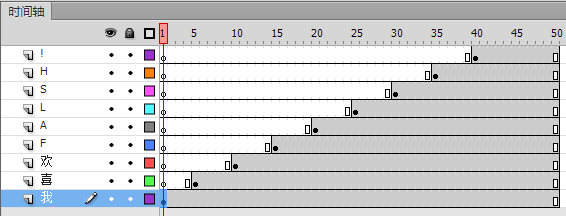 8、按“shift”选中每层的第50帧,点鼠标右键插入帧;然后分别将“喜”、“欢”、“F”、“L”、“A”、“S”、“H”、“!”图层的第1帧移动到下图相应的位置,点击测试场景测试。移动帧操作:先选中要移动的帧,当鼠标形状变为带虚线矩形时按下鼠标左键即可移动位置,每层第一帧的位置,代表了该文字出现的时间。