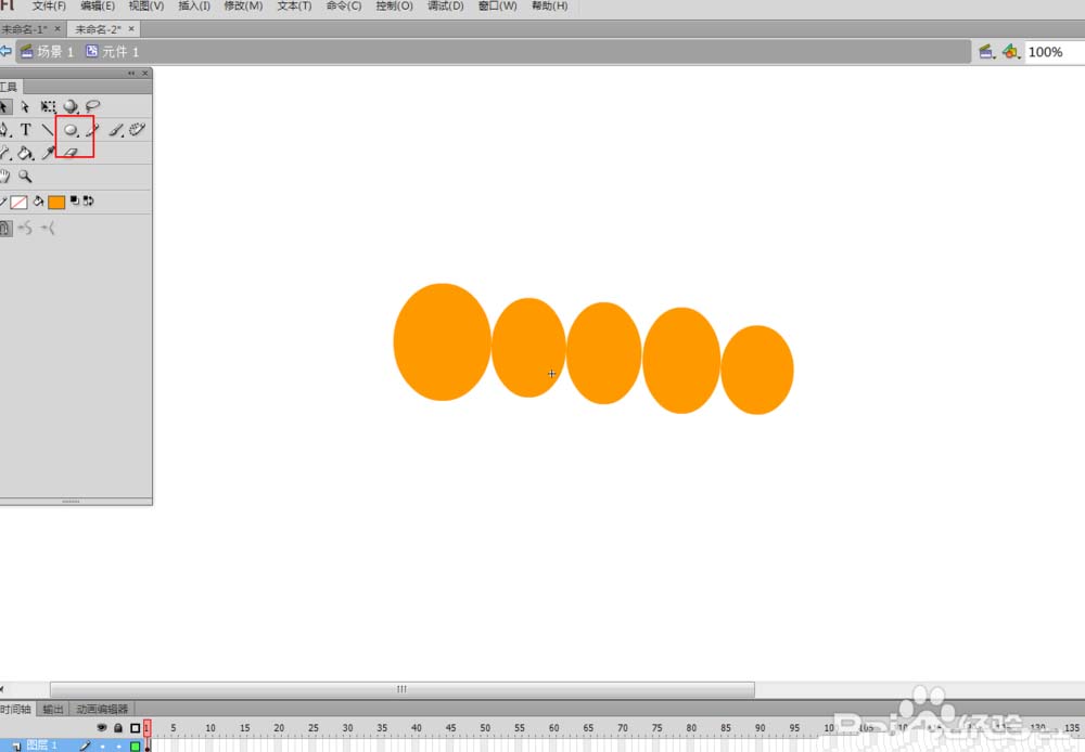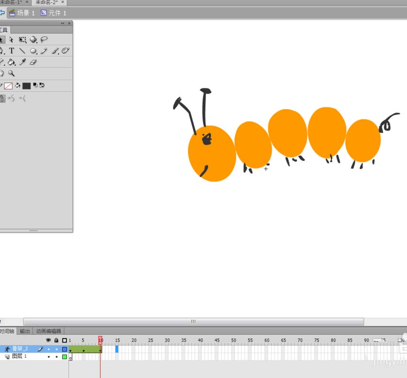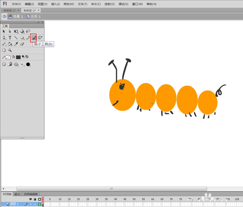 3、在元件编辑区域中选择椭圆工具,绘制毛毛虫的身体和头部。颜色自定