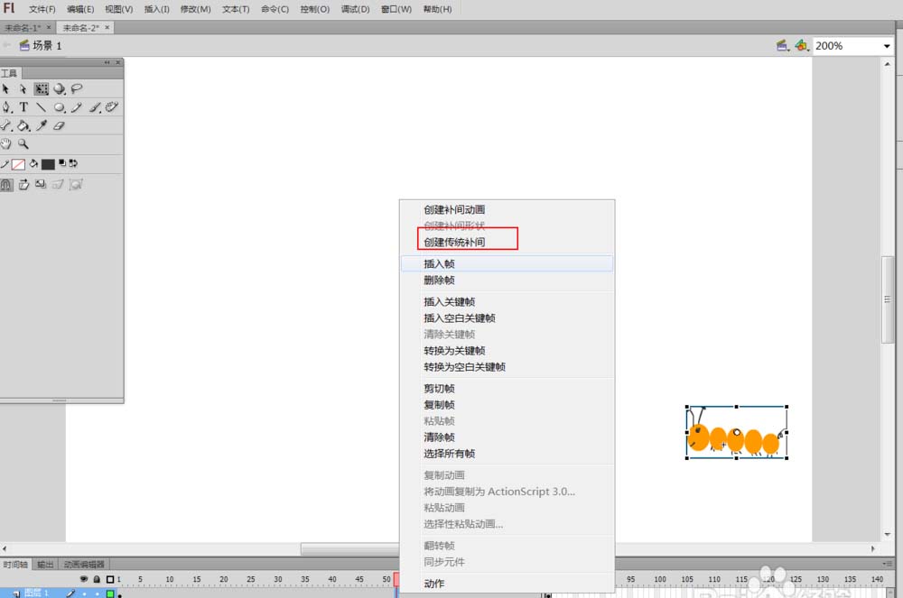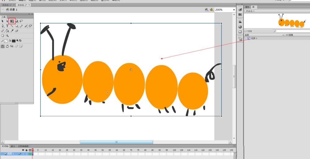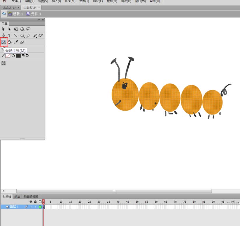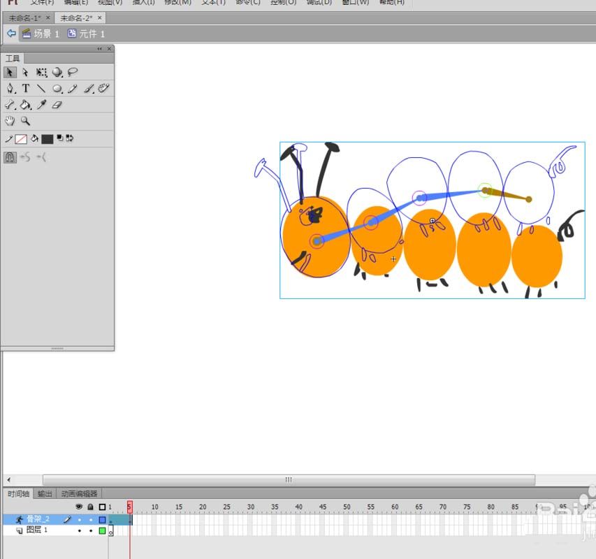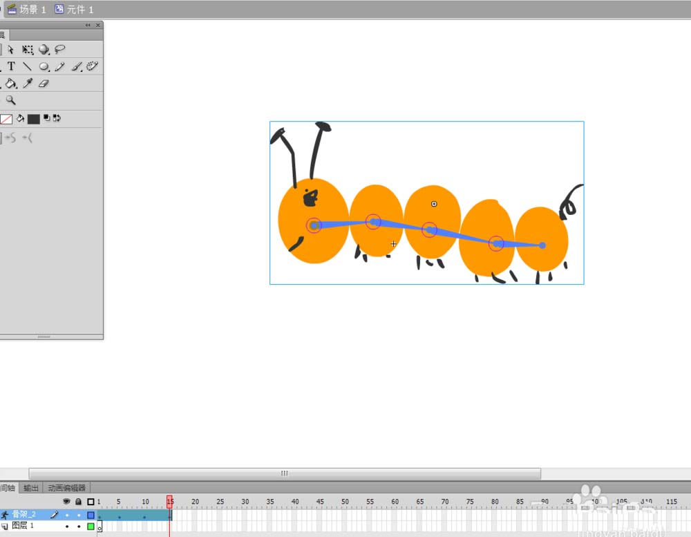 毛毛虫在运动,用flash做出来,这是很简单的,这需要用到一个叫做“骨骼工具”的工具了。