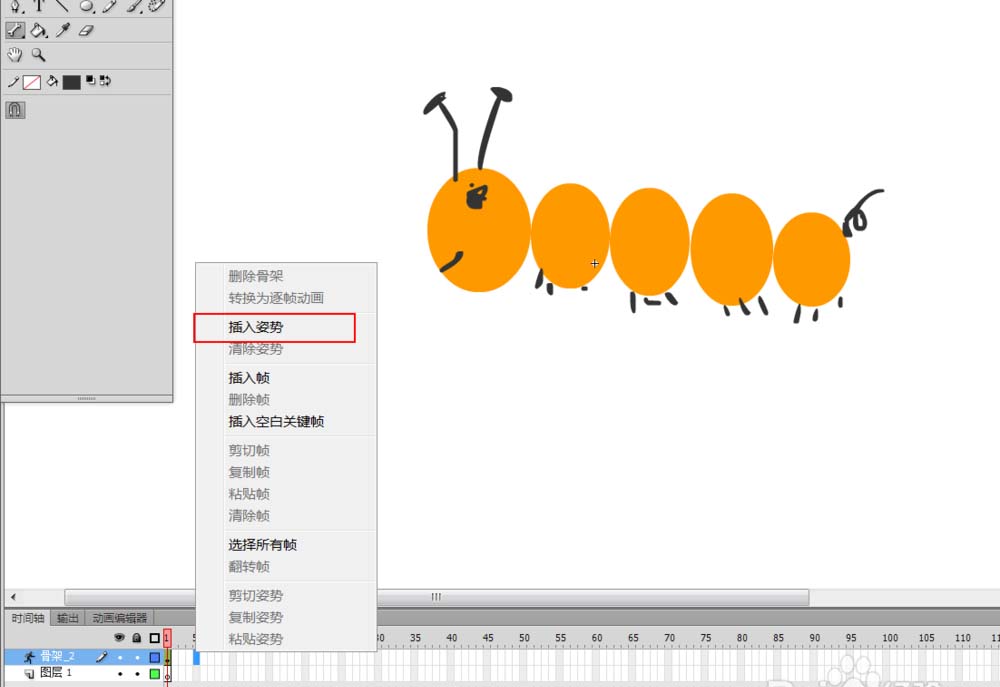 8、然后再分别在第10帧,第15帧上右击选择“插入姿势”,继续改变调整毛毛虫的姿势