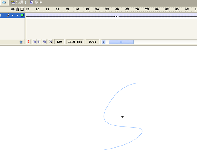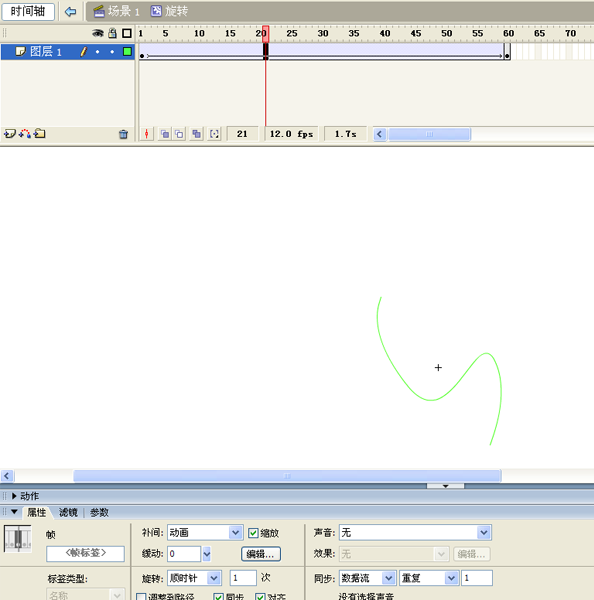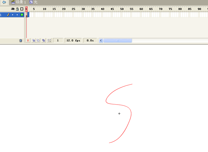 3、选择工具箱里的钢笔工具,在舞台上绘制一个“s”形状,在20帧、40帧处按f6键插入关键帧,并分别改变其颜色,在60帧处插入帧。