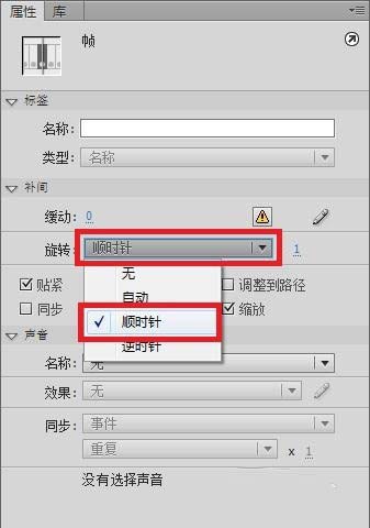 4、紧接着在属性面板,点击旋转选项框,选择“顺时针”。