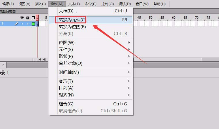 3、选择这个椭圆,在上面的菜单里找到修改菜单,在其下拉菜单里找到转换为元件选项,如图所示: