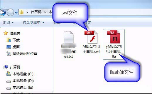 使用flashIDE【例如flashCS6】创作的文件称为源文件,拓展名是.fla,在flashIDE内通过测试影片导出的文件是swf文件,扩展名是.swf。如下图,最右边的文件就是源文件,中央的文件是swf文件