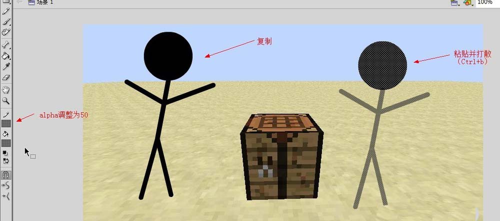 4、火柴人画完了,下面接着画火柴人的影子,这个比较简单。我们选中黑色火柴人,右键点击复制(Ctrl+c),然后右键点击粘贴(Ctrl+v),接着右键点击打散(Ctrl+b)选中复制的火柴人,把笔触和填充的alpha值改为50。选中影子,把他移动到火柴人下面,使用任意变形工具调整角度。