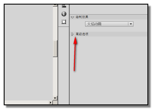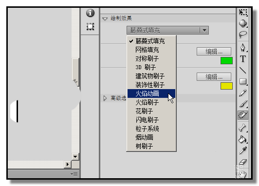 4、在绘制效果这选项里,点下拉按钮,会弹出菜单,然后,我们选择:火焰动画