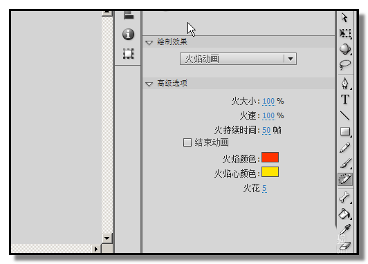 6、设置好后,把鼠标移到舞台上,点下,即产生了火焰动画了。非常方便快捷啊。