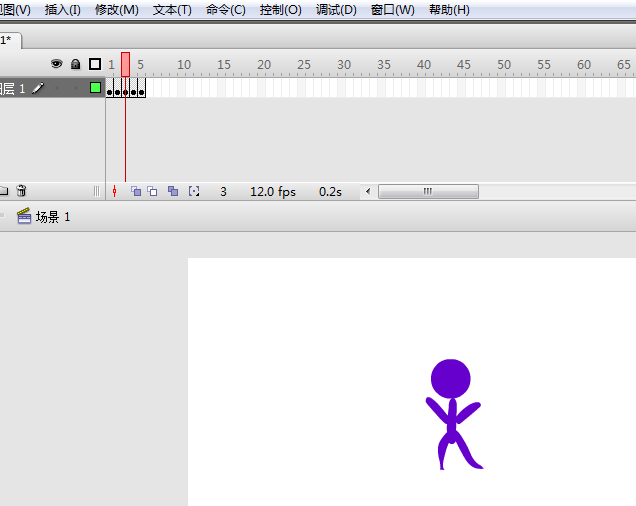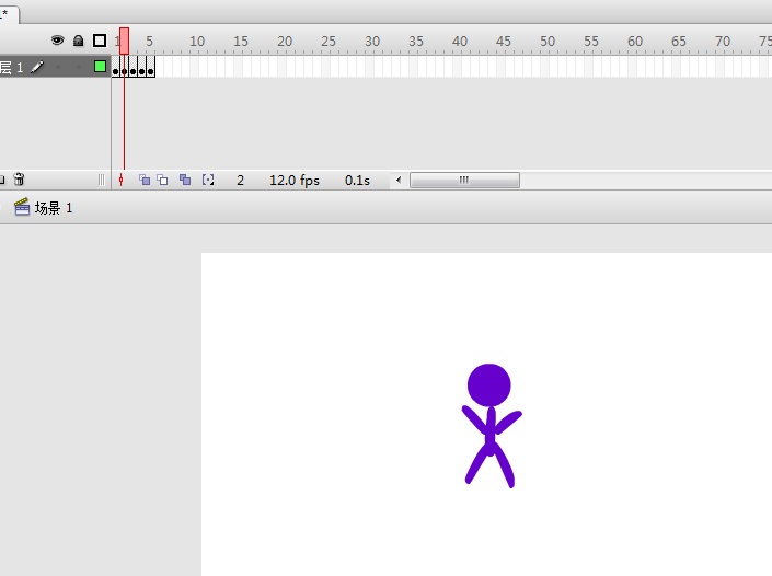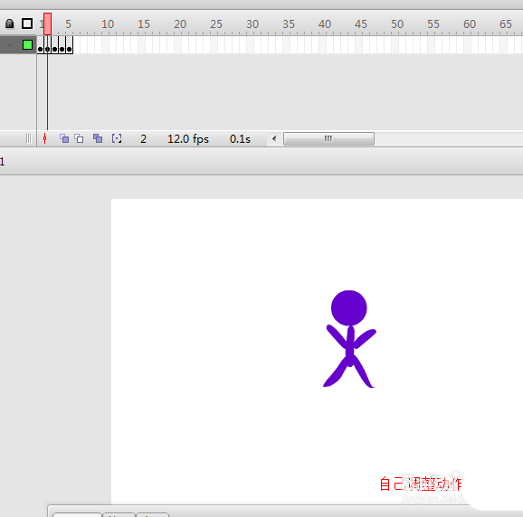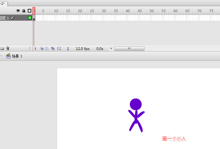1、首先在舞台上的第一帧处画一个小人,怎样画随便,我的画的...咳咳。就不说了