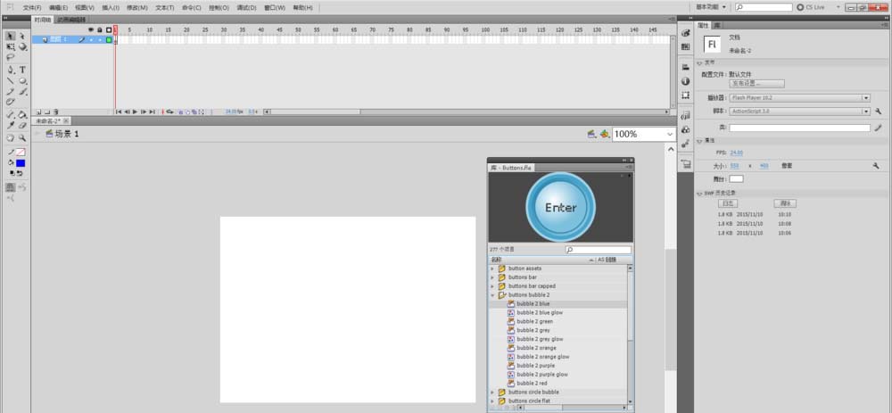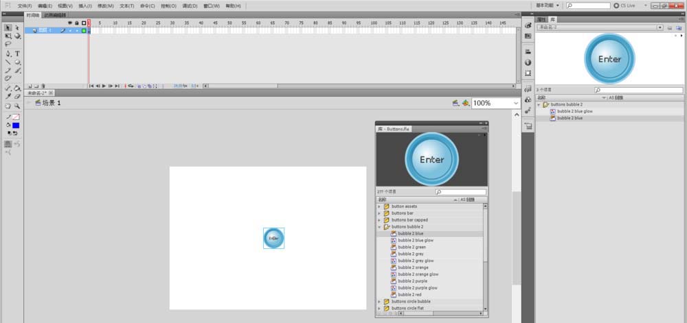 3、拖动到场景中后,在库中就可以看到组成按钮的元件了,如果需要对它进行修改操作,可以双击元件进入编辑模式编辑。