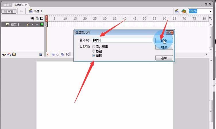 1、这个连接是如何制作树叶儿的方法。好,接下来,首先新建一个元件图形元件,取名为柳树叶。点击确定。。