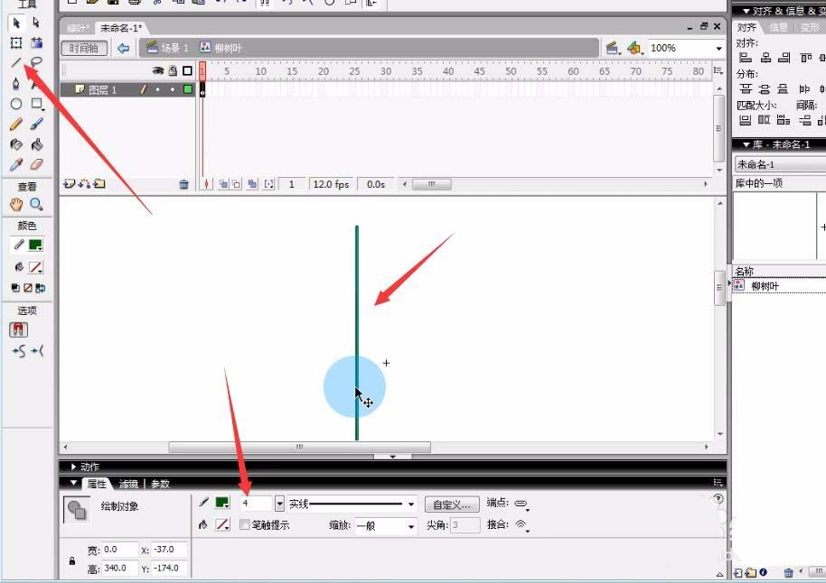 2、接下来笔触颜色选择深绿色。自己选择线条工具,在舞台上绘制一条直线。打开属性面板,将属性面板的,笔触粗细调节为4。然后再点击选择工具将线条,拖弯一些。