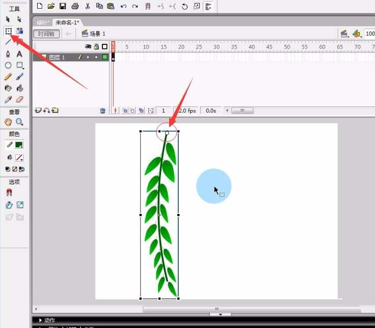 3、调出之前做好的树叶图形元件,将它拖入到舞台,点击任意变形工具,将它变形拖至与线条匹配的叶子大小。将树叶儿安置在线条上。