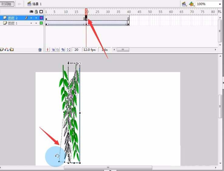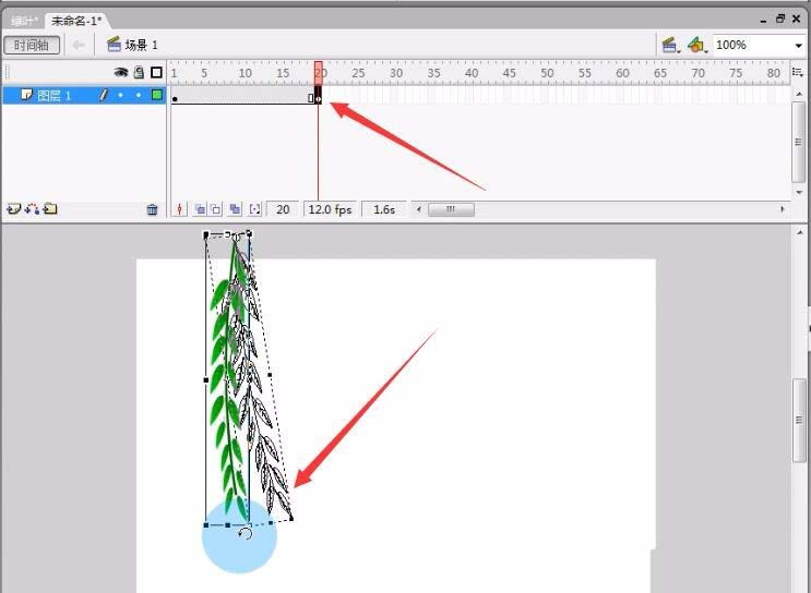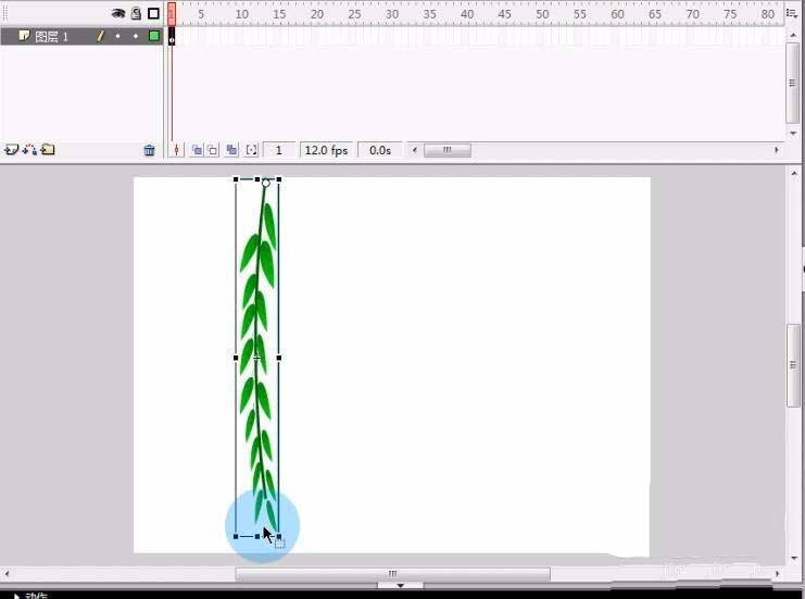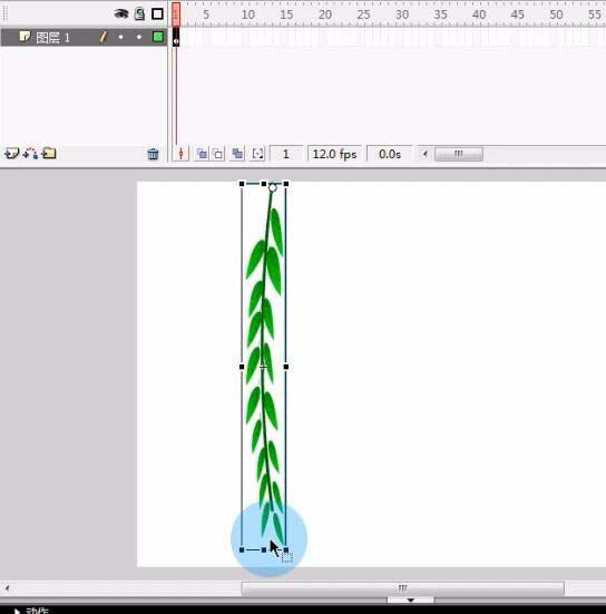 5、然后我们回到场景将制作好的柳树叶拖到舞台。选择任意变形工具将柳树叶的中心点拖至到柳条儿的尾部。再将整个柳树叶压扁一些。