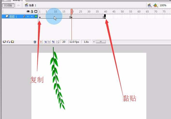 6、将柳条儿放置舞台的顶部,根部要高于舞台。在第20帧处插入关键帧。然后将柳梢部分围绕中心点向右拉动偏移,作为摆动。然后将第一帧复制到第40帧。关键帧之间创建补间动画。一条摆动的柳叶制作完毕。我们可以任意添加几根柳树条。制作不同方向的摆动。还可以添加树叶飘落的效果。