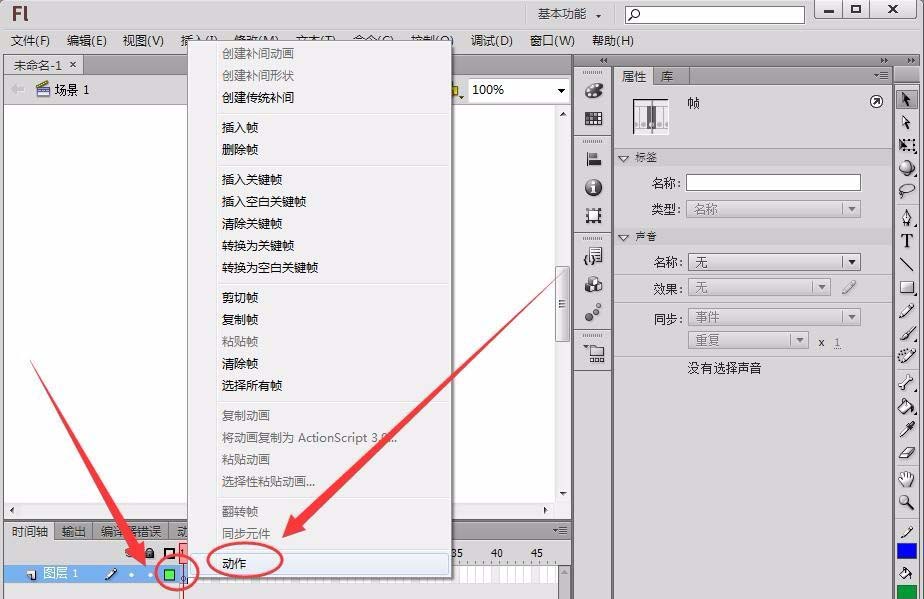 2、在需要输入代码的帧上右击,选择“动作”选项。