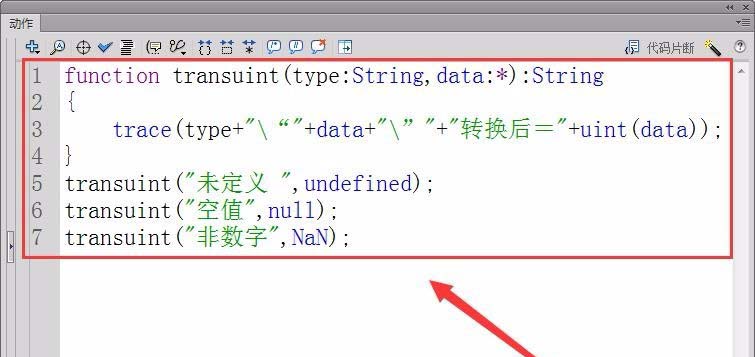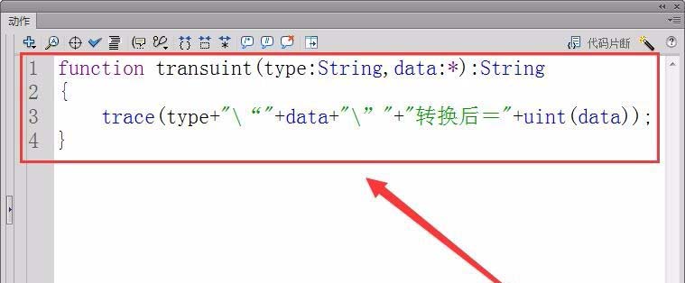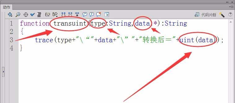 4、代码中的“transuint”是实现类型转换的函数名,“type”是要转换数据的类型,“data”是要转换的数据。uint(data)是将提供的数据转换为uint类型,最后用trace语句将结果输出。
