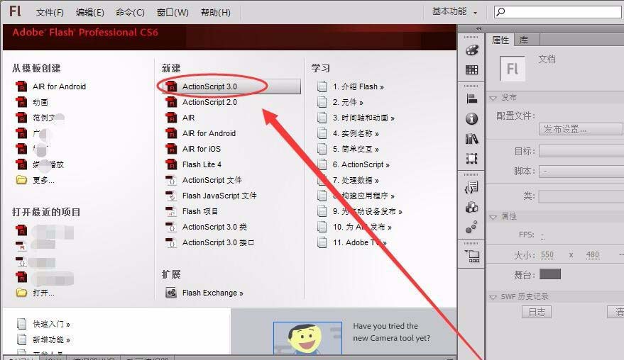 2、单击“ActionScript3.0”,新建一个空白文档。