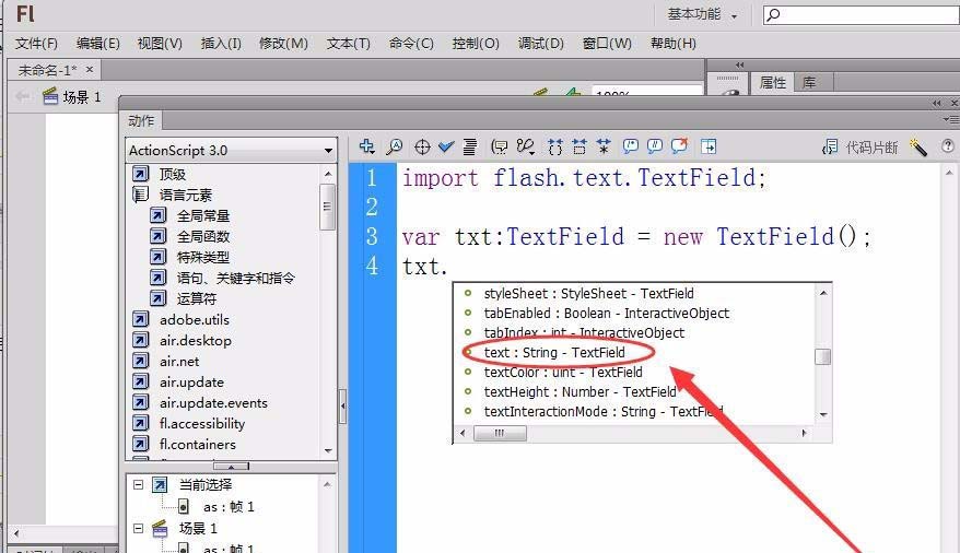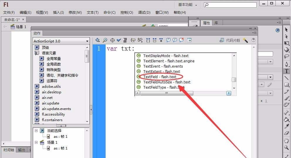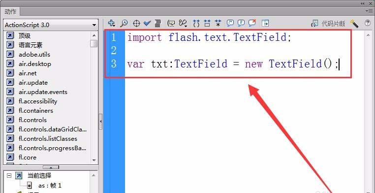 注:FlashCS6想要出现代码提示,一定要先定义变量的类,例如语句“var txt:TextField=new TextFlie()”。