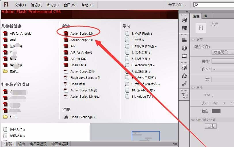 1、打开Flash软件,选择“ActionScript3.0”,新建一个“太阳坐标”的作品。