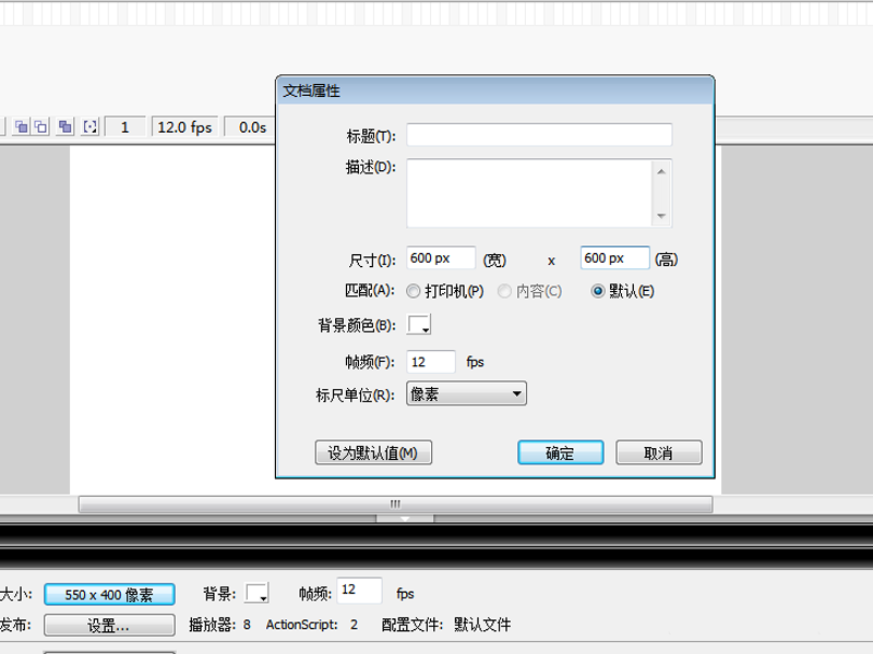 1、首先启动flash8,新建一文档,设置大小为800*800,背景颜色为白色,帧频为12fps